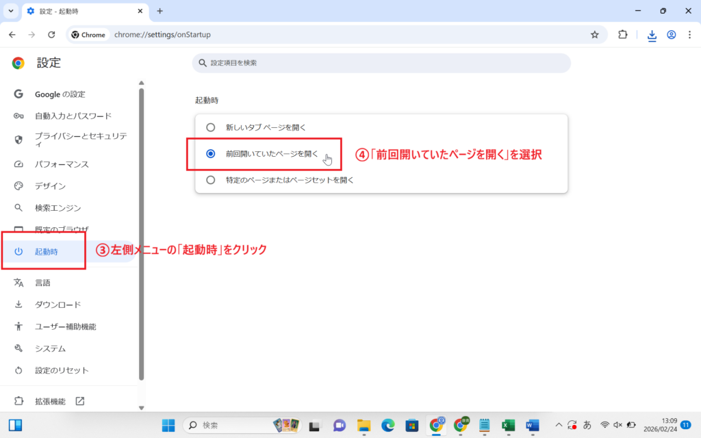 Chromeでは、「起動時」の設定を変更するだけで、前回終了時のウィンドウをそのまま復元できます。特別なツールも不要で、標準機能だけで対応可能です。